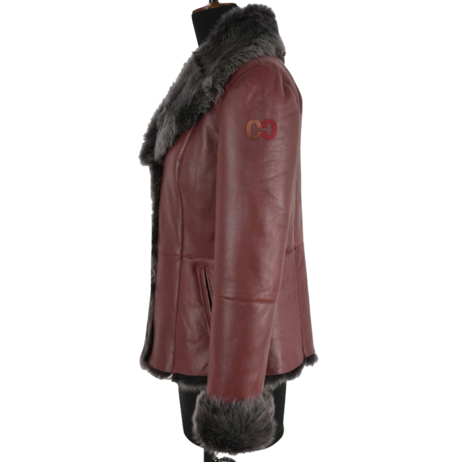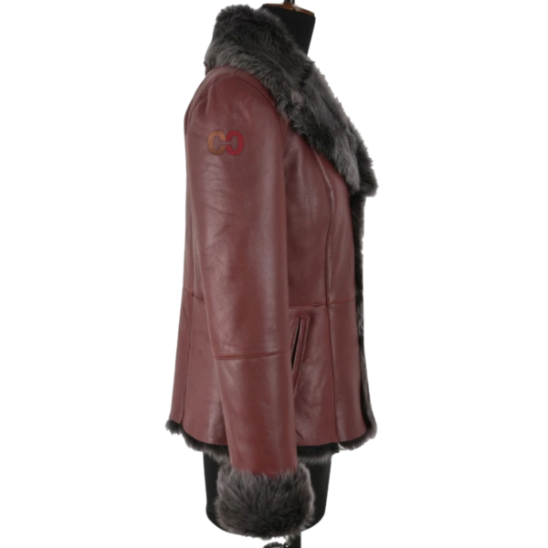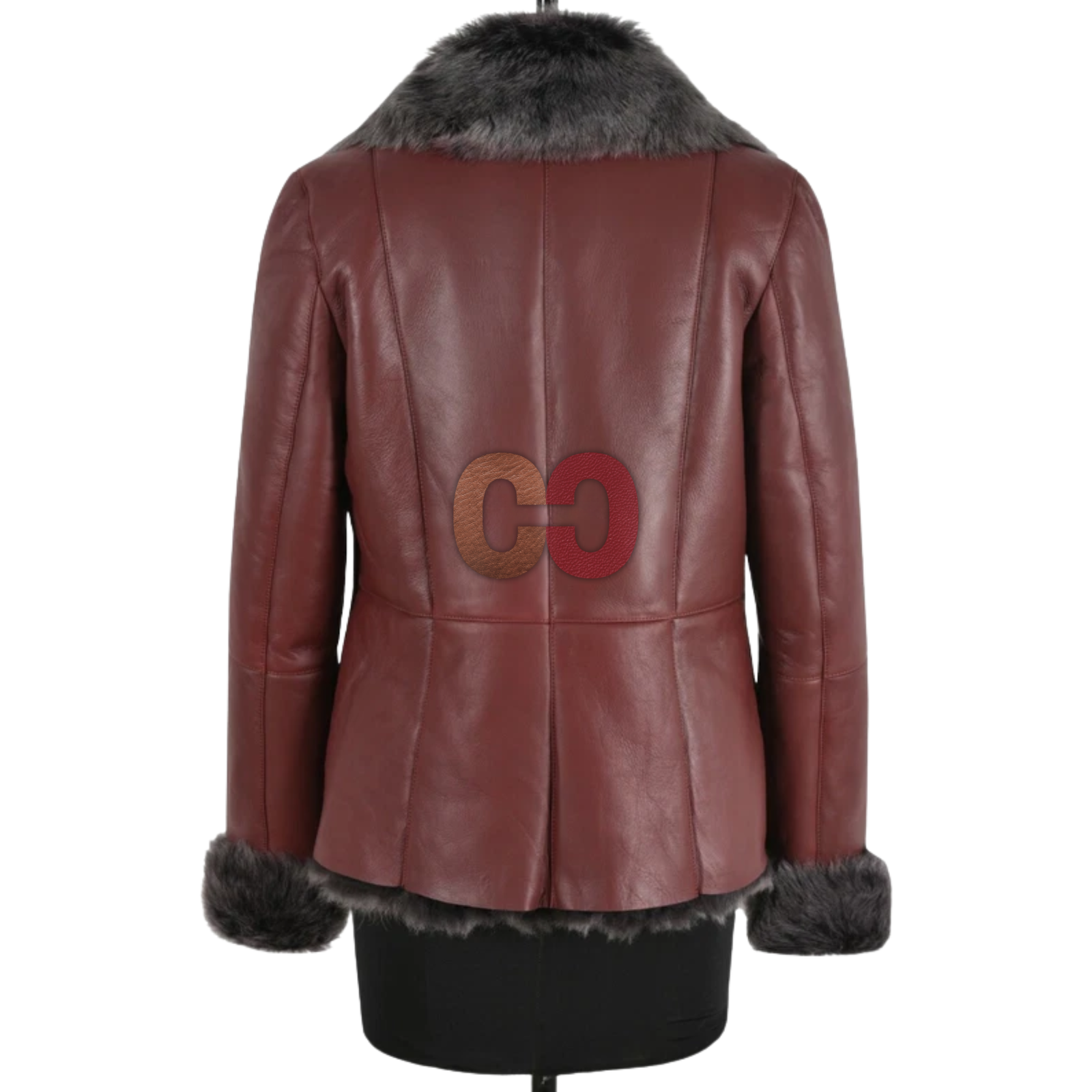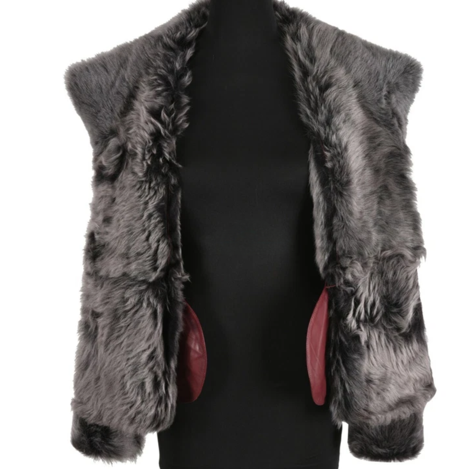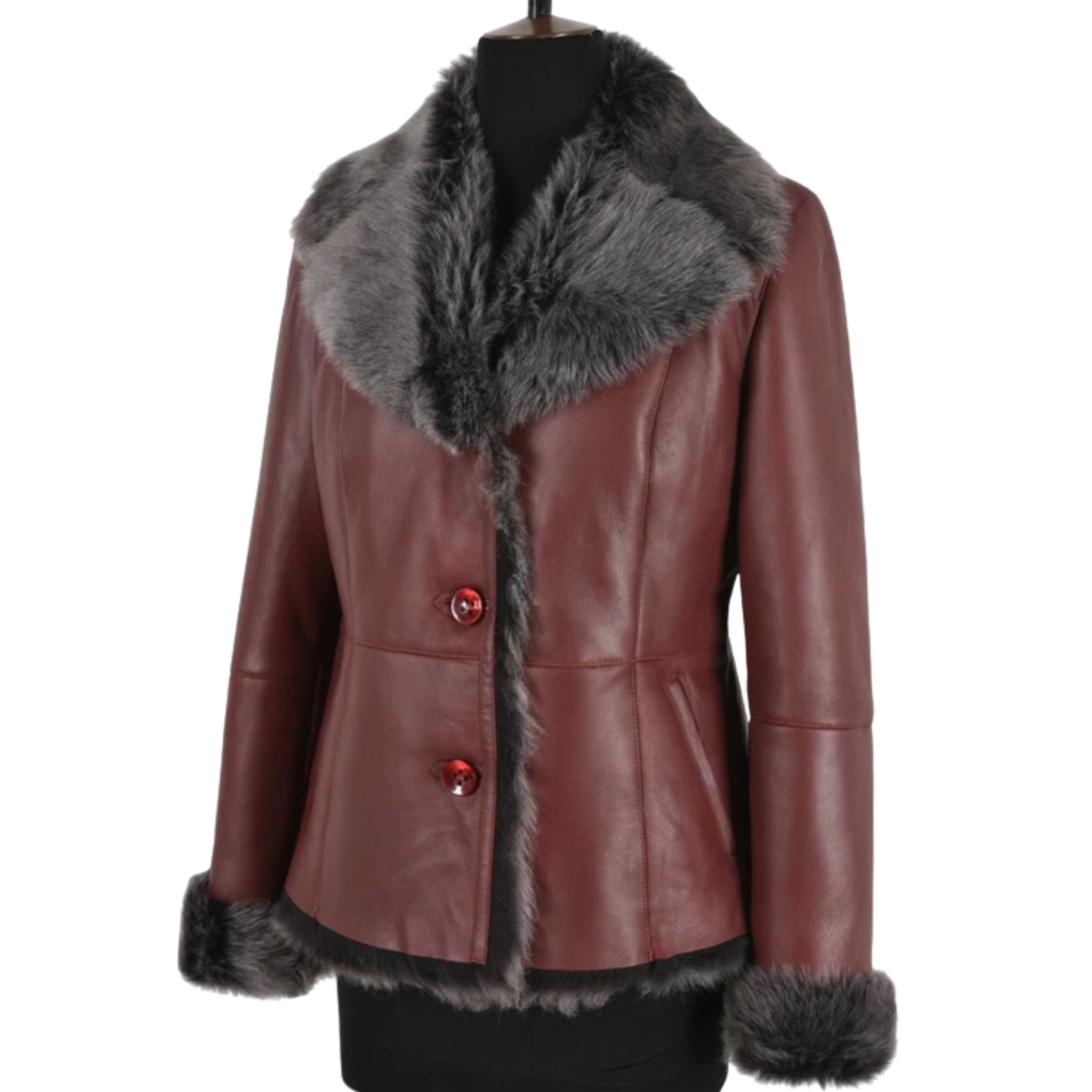- Color: Rich burgundy with contrasting grey fur trim