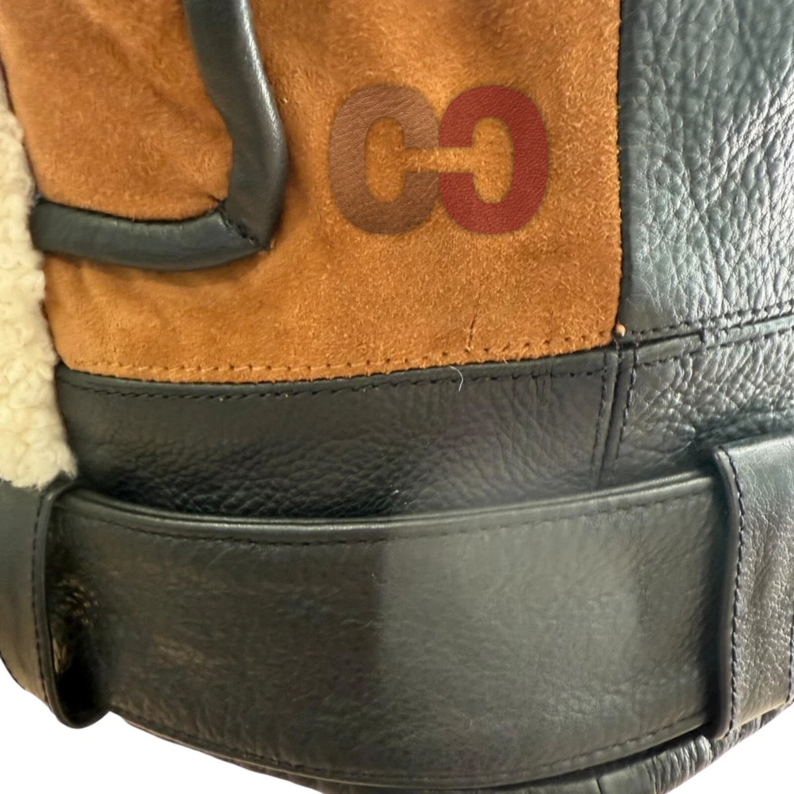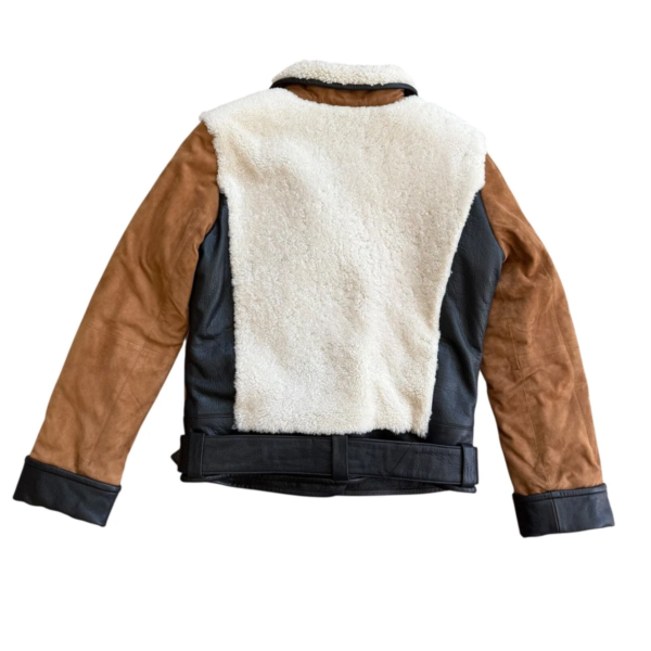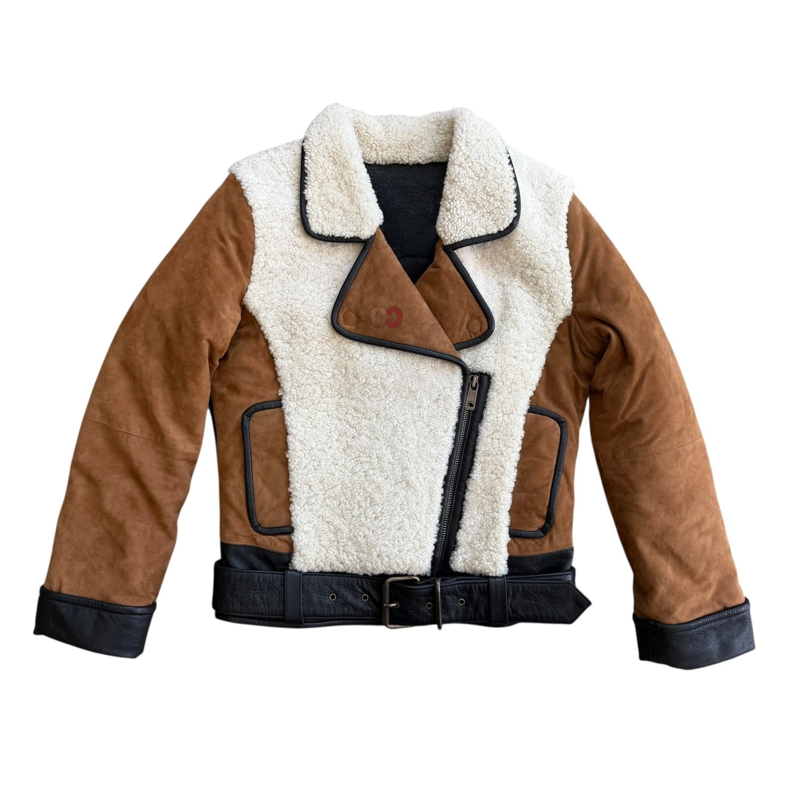 Stay stylish and warm with this brown suede shearling aviator jacket featuring a plush white faux fur lining, black leather accents, and an adjustable waist belt. Perfect for winter street style and casual chic looks.
